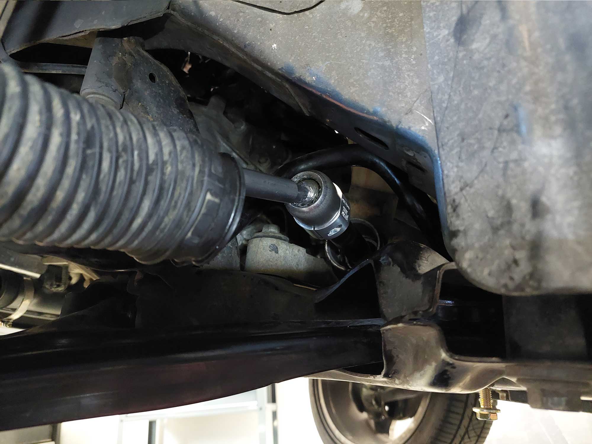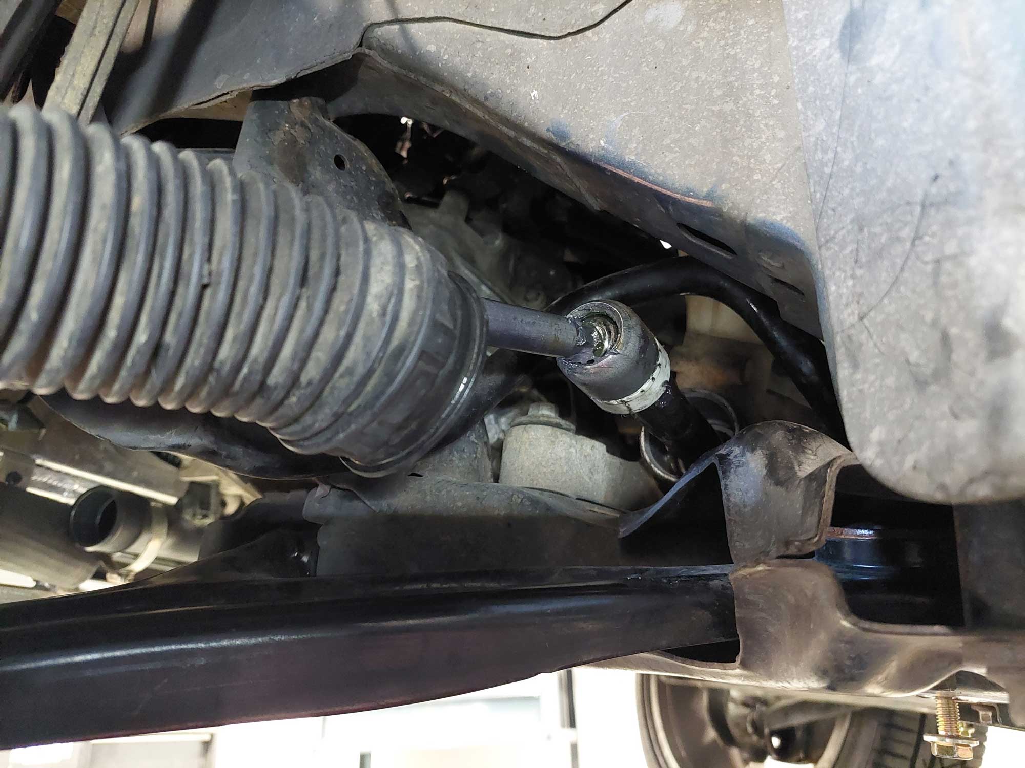 - Attach our steering limiter on the steering rack with the chamfered side facing the center of the car. The steering limiter needs to be butted up against the inner tie rod end, just like the stock one.